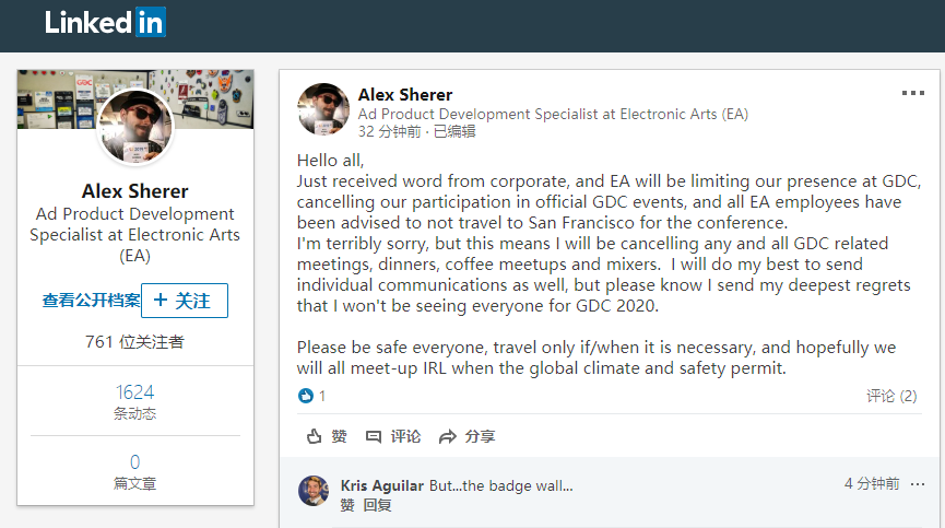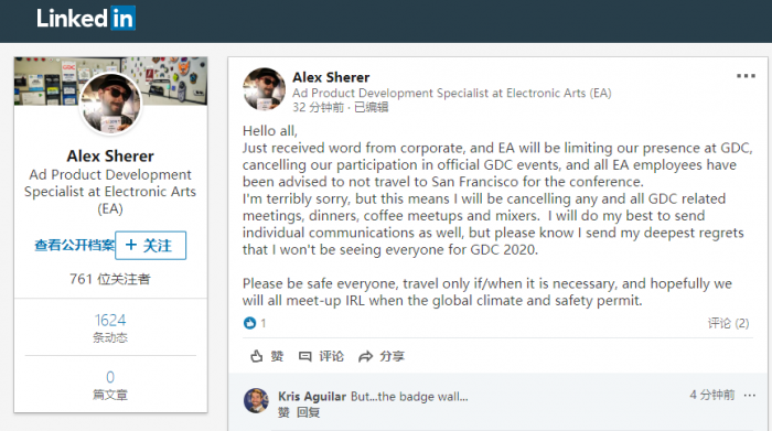 虽然还没有通过官方渠道正式宣布,但是根据EA广告产品开发专员Alex Sherer在领英动态上分享的消息,EA已经开始限制在GDC大会的业务表现;取消了官方GDC大会活动的参与并“建议”所有EA员工不要前往旧金山。