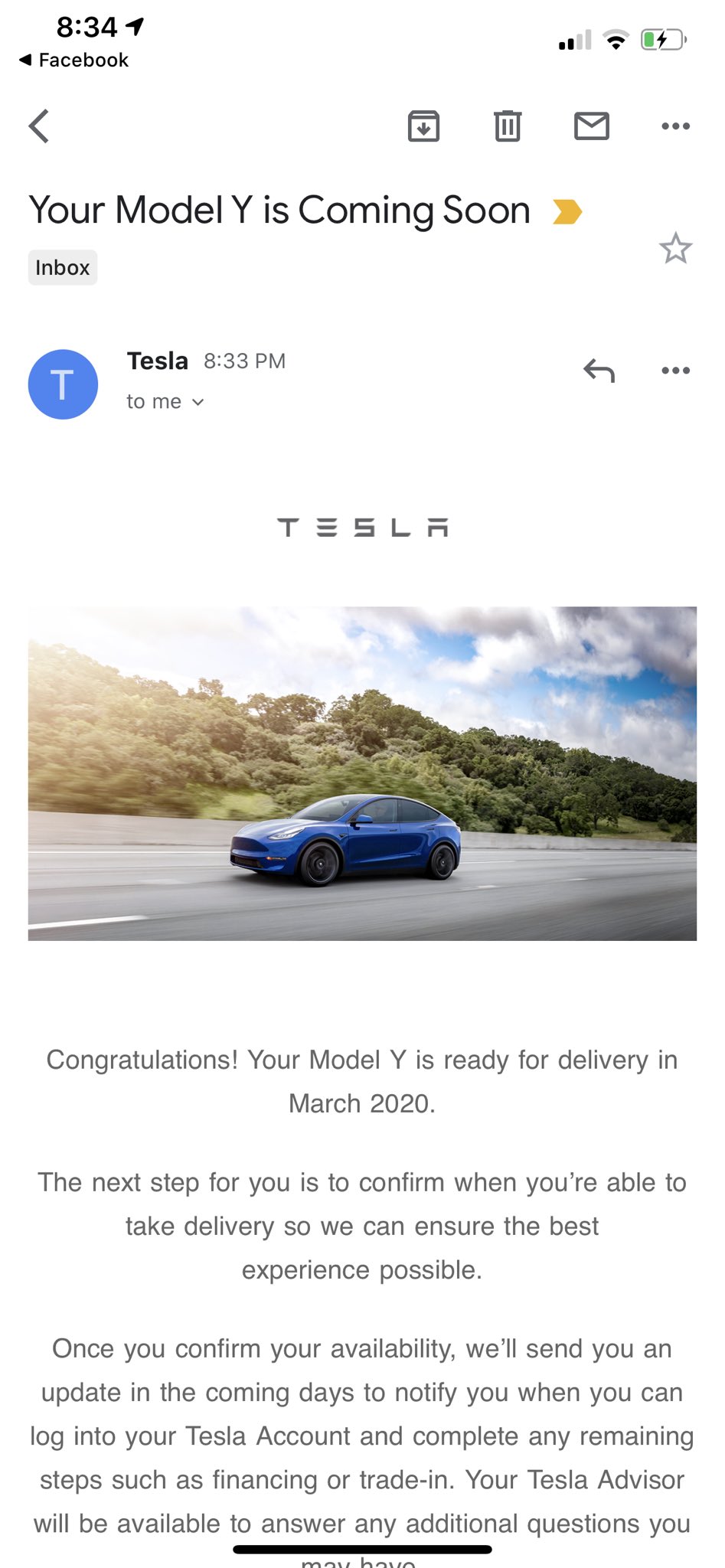 现在特斯拉已经开始向部分客户发送电子邮件,就他们之前的订单进行确认。邮件显示:“恭喜您!您的Model Y可以在2020年3月交付。”