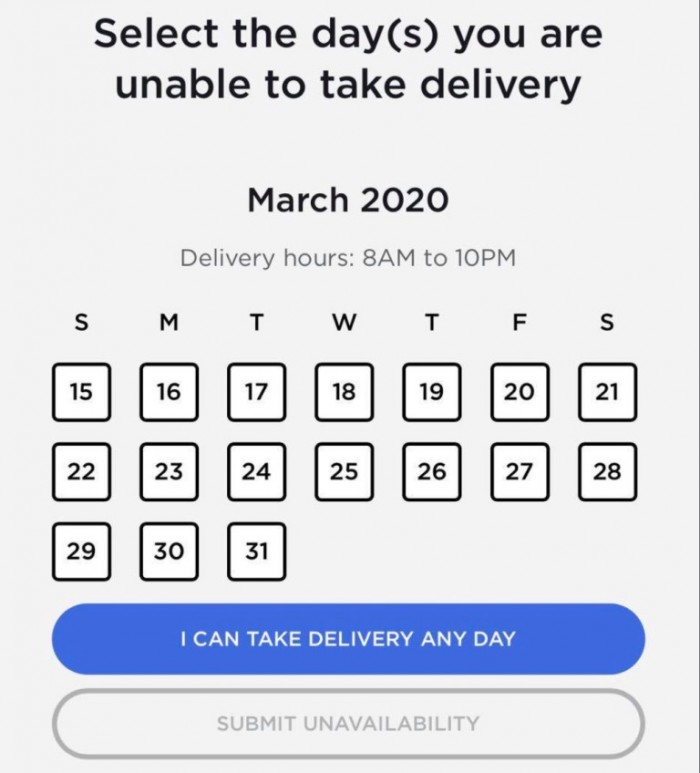 一旦客户登陆特斯拉网站确认提车时间,就会弹出一个日期列表,这样客户就可以确定让特斯拉在3月份交付Model Y的具体日期。到目前为止,客户所提供的信息显示Model Y交付时间均是在3月15日之后。