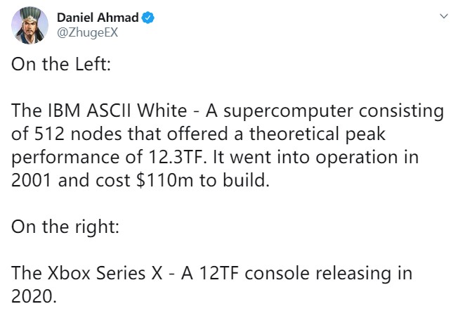 Daniel Ahmad在推特中写道:IBM ASCII White 超级计算机,由512个计算机组成,理论上的峰值性能为12.3TF。它于2001年投入运营,建造成本为1.1亿美元。而Xbox Series X则为2020年发布的12TFs游戏主机。