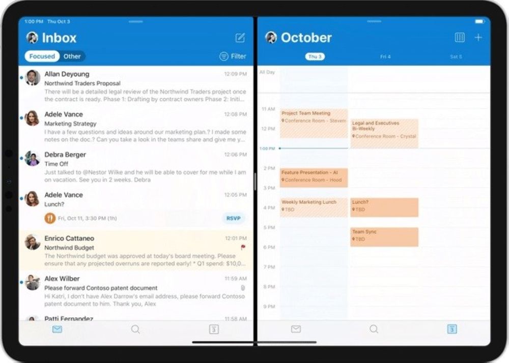 通过iPadOS 13系统内置的多任务视图,用户能够将Outlook拆分成为两个部分,这样你可以一边查看邮件一边确认日程安排。微软还改进了Outlook中电子邮件的撰写窗口,因此现在您可以从文本输入框下方的工具栏中访问格式选项,例如粗体,斜体,下划线和项目符号列表。
