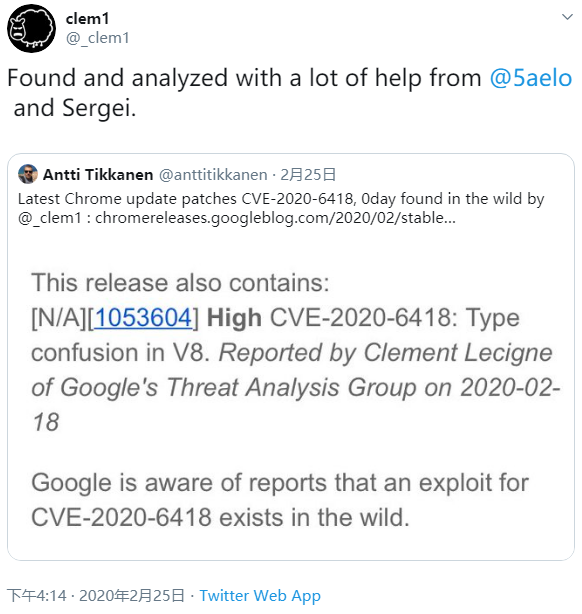 根据 CVE-2020-6418 描述的信息,可知该漏洞与“V8 中的类型混淆”有关。作为 Chrome 浏览器的一个重要组件,其负责 JavaScript 代码的处理。