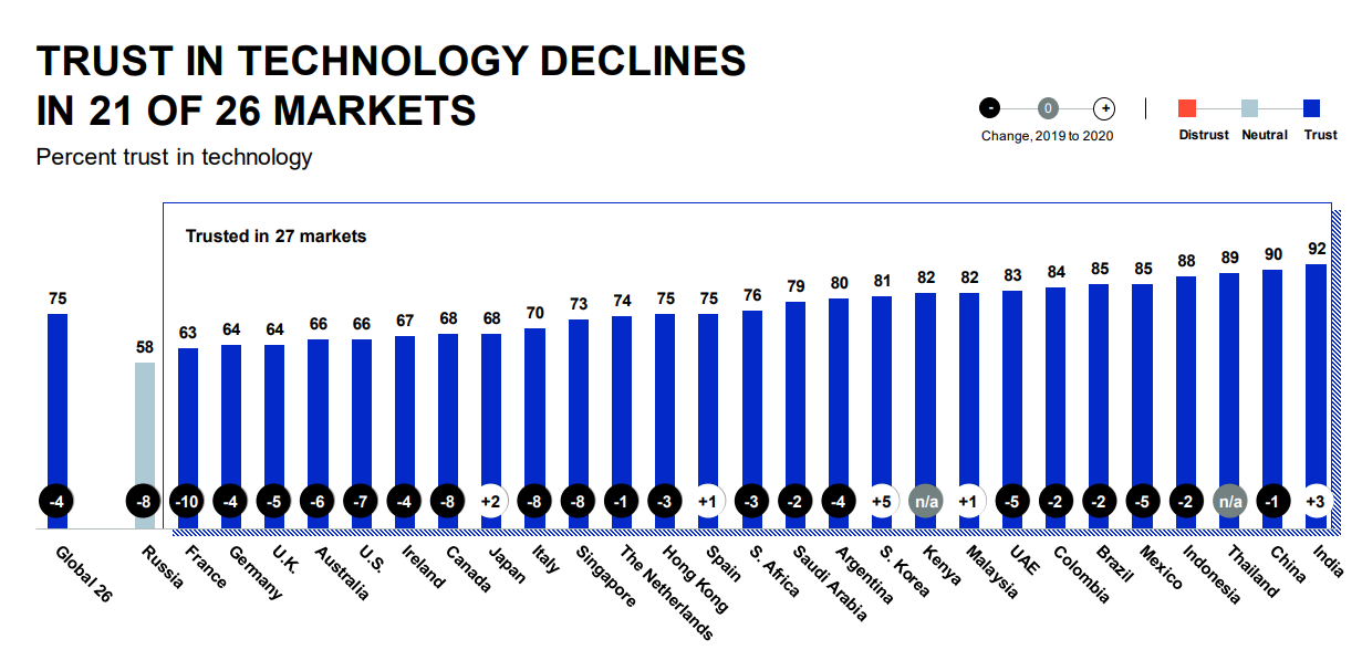 Edelman在报告中说道,信任度的下降凸显了科技公司对于技术可能存在的负面影响保持透明的重要性。这项研究中约有54%的受访者表示,如果科技公司传达出潜在的负面影响,他们对科技公司的信任将会增加。