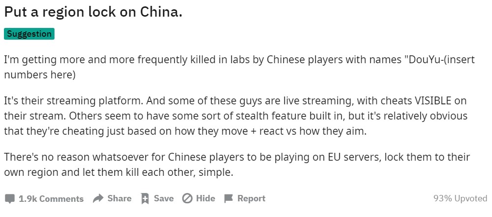 这位玩家在Reddit里发帖表示:“我经常被一位名叫‘DouYu+一段数字’的中国玩家在实验室这张地图中击杀,(斗鱼)这是他们的直播平台。这些(开挂的)家伙中有一些还在直播,他们在直播中就有开挂行为。有的人会通过“演”来掩饰自己开挂作弊,但他们的移动与反应与瞄准射击一对比,就很容易露出马脚。