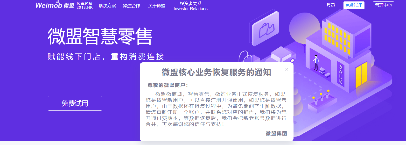 2月26日消息,针对大量媒体报道的核心程序员“删库跑路”事故,微盟官网已经刊登公告介绍了最新进展。据悉,微盟公告表示:微盟微商城,智慧零售,微站业务正式恢复服务。微盟新用户可以直接注册开通使用。微盟老用户,由于数据还在修复过程中,为避免期间产生脏数据,需重新注册一个账户。数据恢复后新老账号数据会进行合并。