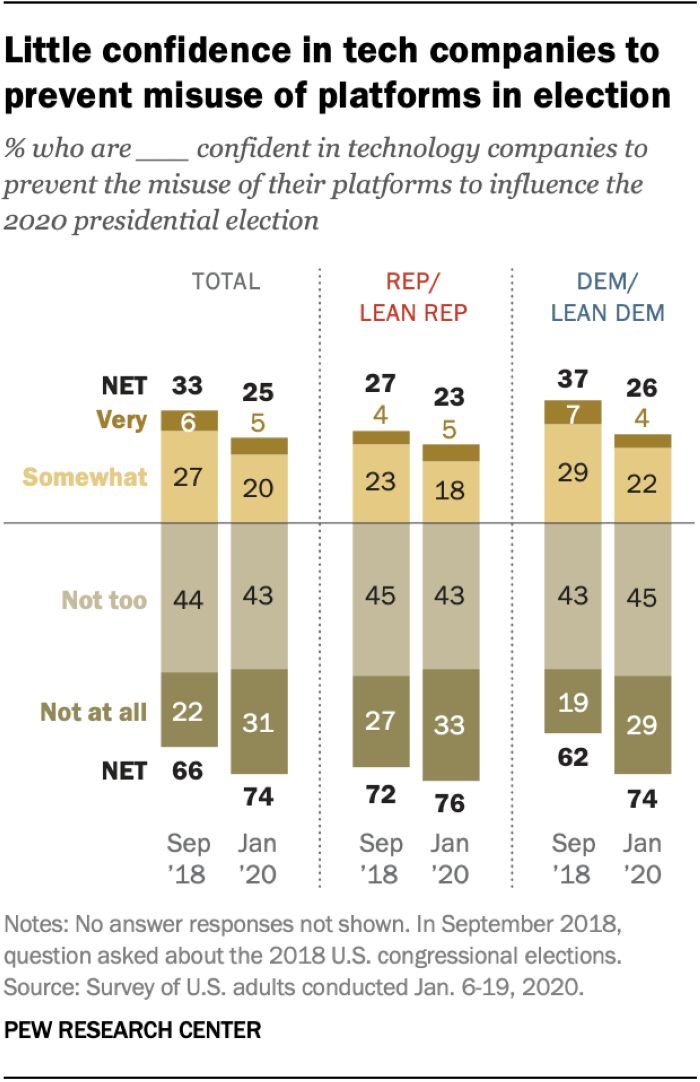 根据皮尤研究中心在今年1月份开展的调查显示,对于像Facebook,Twitter和Google这样的科技公司是否有能力捍卫2020年美国总统大选,将近四分之三(74%)的美国人表示很少或者没有信心。同时还有78%的人认为这些公司有责任防止自家平台被滥用。