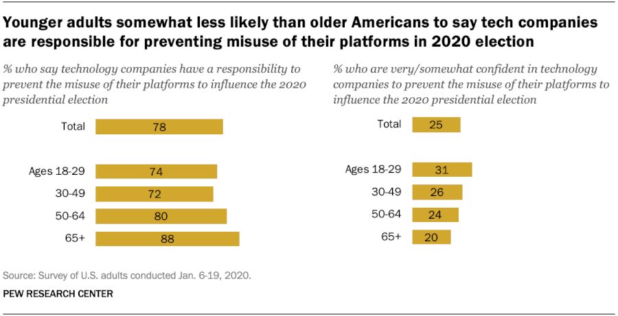 30岁以下的成年人对科技公司的信任度也比老年人高:在18至29岁的年轻人中,有31%的人表示至少对这些公司充满信心,以防止滥用平台影响选举,而其中的20% 65岁以上的人至少有一定的信心。