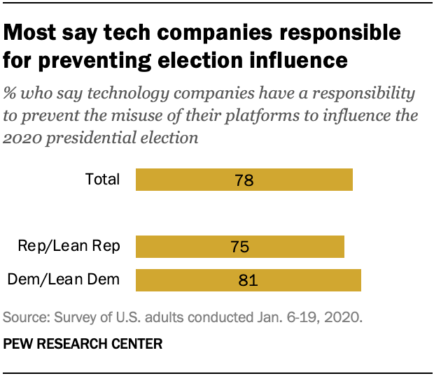 将近十分之八的美国人(78%)表示,这些科技公司有责任防止滥用平台来影响选举,绝大多数共和党人(75%)和民主党人(81%)都认为科技公司有责任防止滥用。