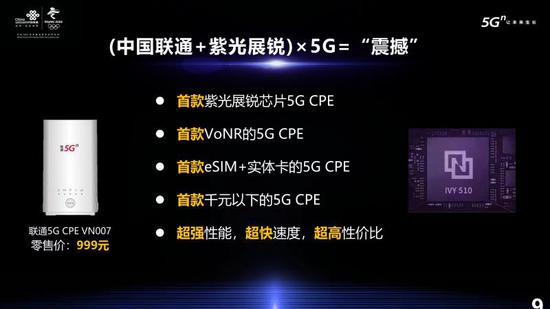 发布会上,联通5G CPE亮相,新品搭载紫光展锐春藤V510芯片、VoNR 以及eSIM和实体卡双,售价999元。