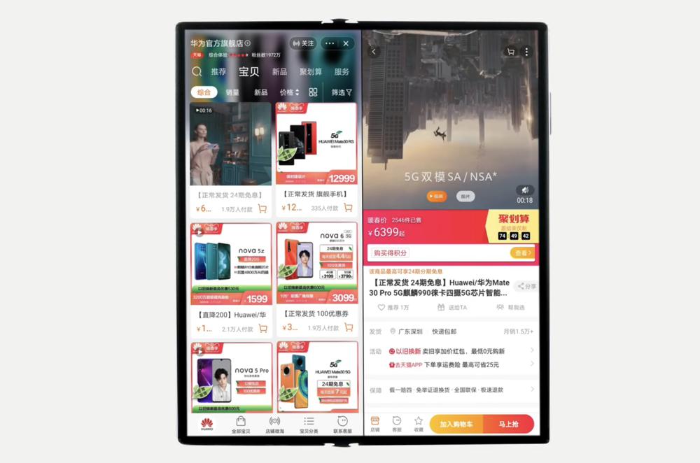 对于一些兼容应用,还能在展开形态下实现二级任务菜单的高效率体验,比如网购应用可以左半屏展示商品目录,右半屏展示具体商品信息,挑选商品的效率得到不少提升;在一些移动办公应用中,还可支持打开两级任务界面,一边浏览收件箱,一边查阅详细信息,进行编辑回复,同时显示,提高效率。