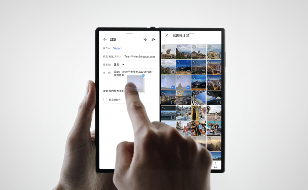 二是两个应用间的直接拖拽传输文件,让华为Mate Xs实现了如同PC级别的高效操作。图片、文字、视频等文件都可以在两个应用间拖拽复制,如用户同时运行华为图库和华为记事本时,还可以直接将图库中的图片直接拖入记事本进行编辑,又或者直接将记事本的文字拖入软件中进行处理。