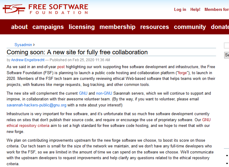 此外,FSF 也一直在研究候选程序列表,并根据道德和实践标准对其进行分析,目标是首次运行在 GNU 道德存储库标准上达到 B 级,然后在发布后力达 A 级。达到 B 级的要求:支持 LibreJS、没有第三方跟踪以及正确的许可证信息等等。除此之外,FSF 还为大家提出了一系列实用标准,其中包括双因子身份验证(2FA)和高性能,在上游得到良好支持以及其他常见的 forge 功能。
