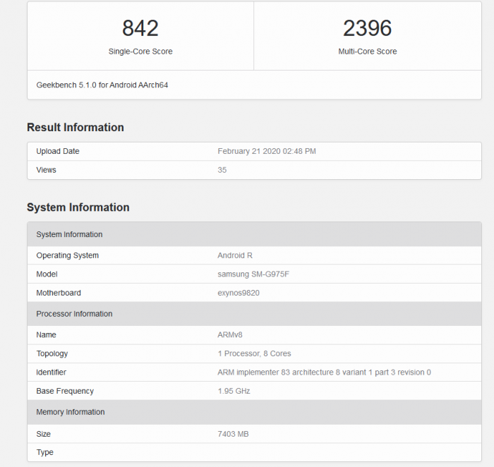 上周,谷歌发布了Android 11第一版开发者预览系统,Pixel 2~5代设备均可尝鲜。厂牌中,Essential PH-1、Poco X2等也已承诺将予升级。经查,Geekbench 5.1中出现了型号SM-G975F的三星Galaxy S10+,它已经运行在了Android 11 R系统上。