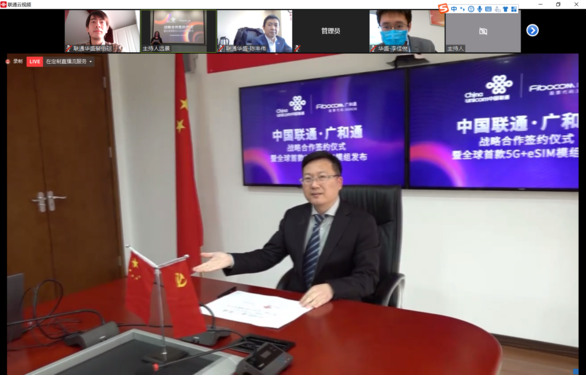 签约过程中,王启明表示,2020年是5G产业的机遇之年,中国联通秉承着开放创新的合作理念,坚持创新驱动发展,致力于将以5G、eSIM为代表的新兴技术赋能各行各业,全面服务于经济社会民生。张云勇也强调到,通信行业在新冠疫情和外部环境的双重考验下,将迎来政策上的利好和泛终端快速发展的利好,而此次中国联通采用“云发布”的方式联合广和通推出5G eSIM通信模组正是在用实际行动响应党中央共战疫情、复工复产、加快5G发展的号召和要求。