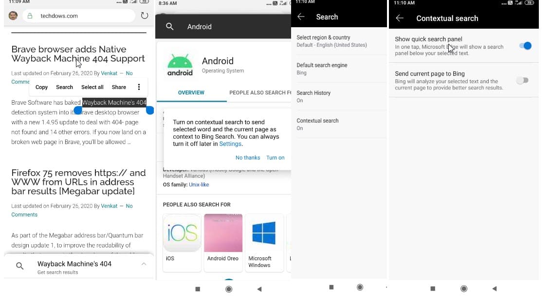 Android版的Edge现在提供上下文搜索,并将单词和活动页面发送到Bing以在屏幕上显示结果。这是在Edge中启用功能的方法。在Android版Edge启用上下文搜索方法如下:1.启动Edge浏览器,2.打开菜单,选择设置>搜索,3.将“默认搜索引擎”设置为“必应”,然后选择“上下文搜索”,“快速搜索面板”和“将当前页面发送到必应”三项设置。