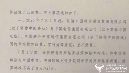 一、2020年7月1日起,取消中国移动通信集团有限公司(以下简称中国移动)与中国电信集团有限公司(以下简称中国电信)、中国联合网络通信集团有限公司(以下简称中国联通)间的单向结算政策,实行对等互联,互不结算。