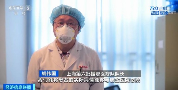 上海第六批援鄂医疗队队长 胡伟国:做远程的会诊,“小白”起了很大的作用,我们能将患者的实际病情与瑞金医院总院,跟我们这边的医生团队,三方做个很好的沟通以及交流,为患者得到一个最佳的诊治方案起很大的作用。