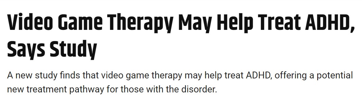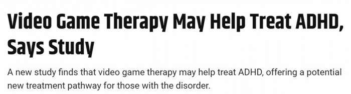 四个星期后,研究发现接受游戏治疗的儿童在注意力跨度相关测试中的表现优于对照组。之前,游戏经常被用作暴力行为的替罪羊,甚至有人将大规模枪击归咎于游戏。