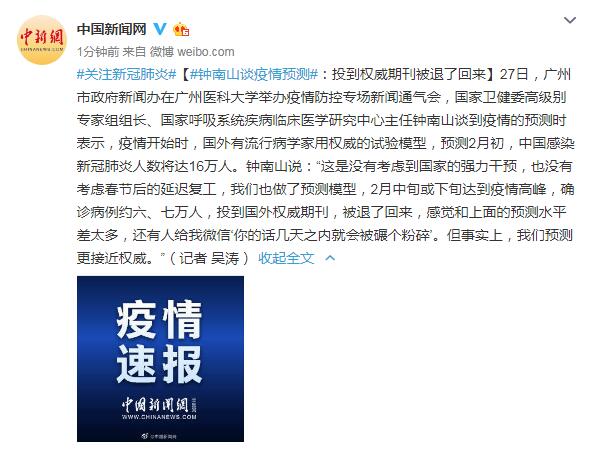 钟南山说:“这是没有考虑到国家的强力干预,也没有考虑春节后的延迟复工,我们也做了预测模型,2月中旬或下旬达到疫情高峰,确诊病例约六、七万人,投到国外权威期刊,被退了回来,感觉和上面的预测水平差太多,还有人给我微信‘你的话几天之内就会被碾个粉碎’。但事实上,我们预测更接近权威。”
