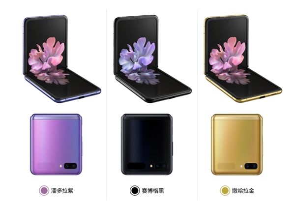 三星Galaxy Z Flip共提供三种不同颜色,分别为潘多拉紫、赛博格黑、撒哈拉金。