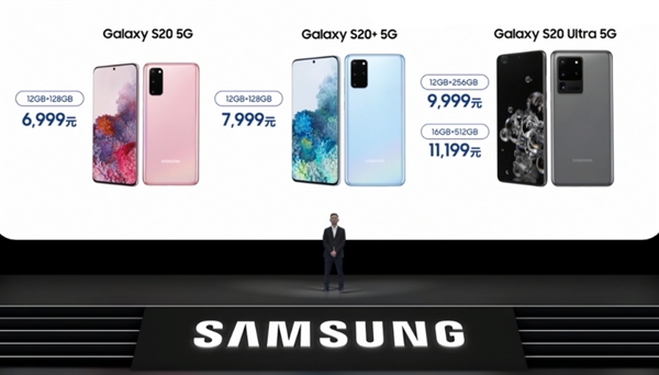最后是大家非常关心的价格:S20 12GB+128GB 6999元、S20+ 12GB+128GB 7999元、S20 Ultra 12GB+256GB 9999元、S20 Ultra 16GB+512GB 11199元。