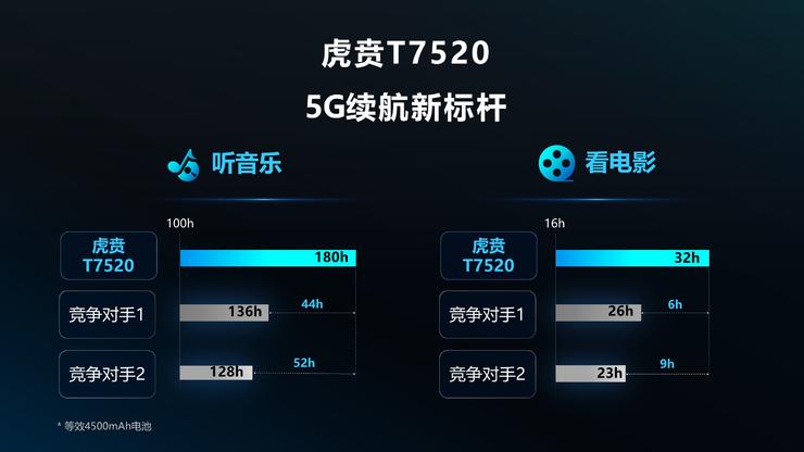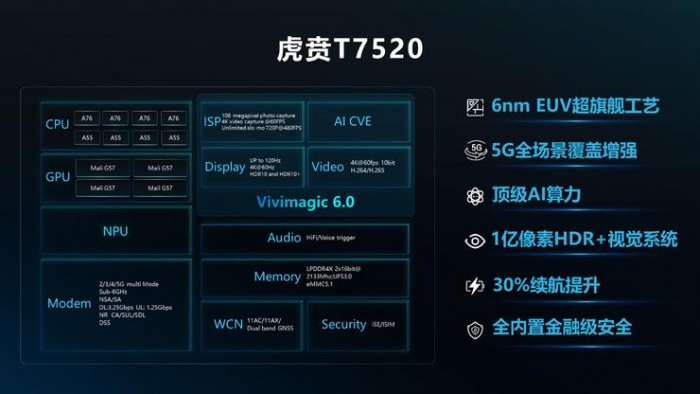 另外,虎贲T7520采用全新一代多核显示架构,最高支持120Hz的刷新率,全通路、全格式HDR标准渲染能力,多屏显示最高可支持4K HDR 10+,能极大提升用户在高帧率类竞技游戏、5G超高清视频观影、AR/VR等视觉沉浸式场景上的体验。