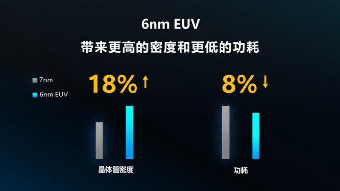 用数字来体现这种量化的优势,相比上7nm,6nm EUV晶体管密度提高了18%,这将使芯片单位面积内集成更多的晶体管,芯片功耗降低8%,可提供更长的续航时间。