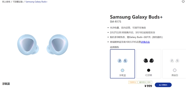 随后,三星官网显示国行版Galaxy Buds+售价与前代首发价一致——999元,将在2月27日20:30预售开启,3月10日起陆续发货。