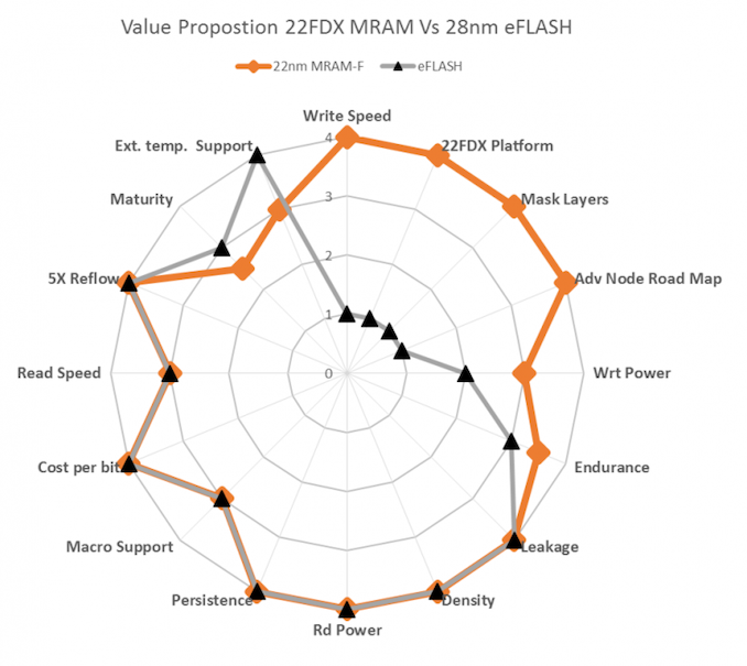 与当今广泛使用的eFlash相比,eMRAM具有许多优势,它不涉及电荷或电流,而是使用磁存储元件,并依赖于读取由薄势垒分隔的两个铁磁膜的磁各向异性。该方法在写入数据之前不需要擦除周期,这意味着更高的性能。此外,可以使用现代工艺技术生产MRAM,并且具有很高的耐久性。该技术有一些缺点,最终将通过使用ReRAM的制造工艺来解决,但GlobalFoundries和三星Foundry认为MRAM在绝大多数应用中都具有巨大潜力。