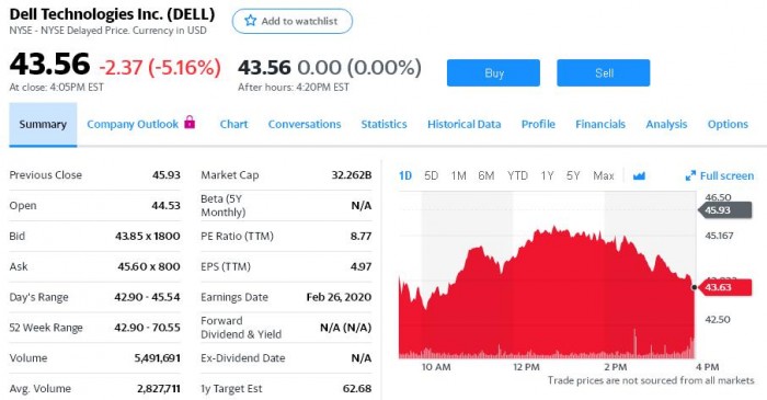 戴尔星期四在纽交所的开盘价为44.53美元。截至收盘,戴尔股价下跌2.37美元,报收于43.56美元,跌幅为5.16%。过去52周,戴尔股价最高为70.55美元,最低为42.90美元。