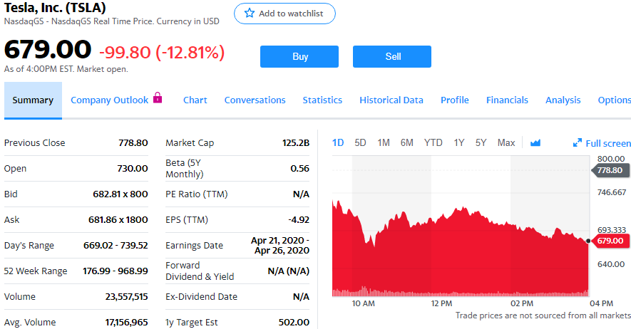 星期四特斯拉股价大幅下跌,盘中跌幅一度高达14%。毋庸置疑的是,特斯拉股价下跌与大盘有关,但利空消息无疑起到了推波助澜的作用。根据权威的中国汽车信息网数据,1月份特斯拉在华新车注册量为3563辆,低于去年12月份的6643辆。在1月份登记注册的特斯拉新车中,有2605辆是在中国制造的。特斯拉因中国工厂假期延长而推迟了原计划今年早些时候交付的Model 3交付时间。特斯拉中国工厂已于2月初复工。另外,摩根士丹利分析师亚当·乔纳斯(Adam Jonas)对未来数年特斯拉电动汽车市场份额会遭到传统汽车厂商蚕食表示担忧后,部分投资者心态也发生了变化。乔纳斯维持对特斯拉股票的“减持”评级,以及500美元的目标股价。虽然过去一周特斯拉股价大幅下跌,但过去6个月其涨幅仍然高达230%。经过如此大幅度的上涨后,投资者应当能预期到未来其股价会出现一些震荡,尤其是在疫情传播的当下。今天常规交易中,特斯拉股价下跌99.8美元,跌幅为12.81%,报收于679美元。