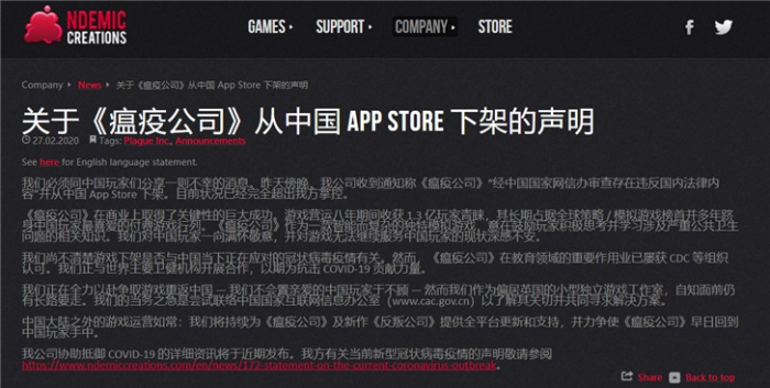 作为一款大热的游戏,《瘟疫公司》曾连续21天稳居付费榜第一,但是苹果中国却对其进行了下架。对于这样的做法,《瘟疫公司》官方给出的回应称,“我们尚不清楚游戏下架是否与中国当下正在应对的冠状病毒疫情有关。然而,《瘟疫公司》在教育领域的重要作用业已屡获CDC等组织认可。我们正与世界主要卫健机构开展合作,以期为抗击COVID-19贡献力量。”