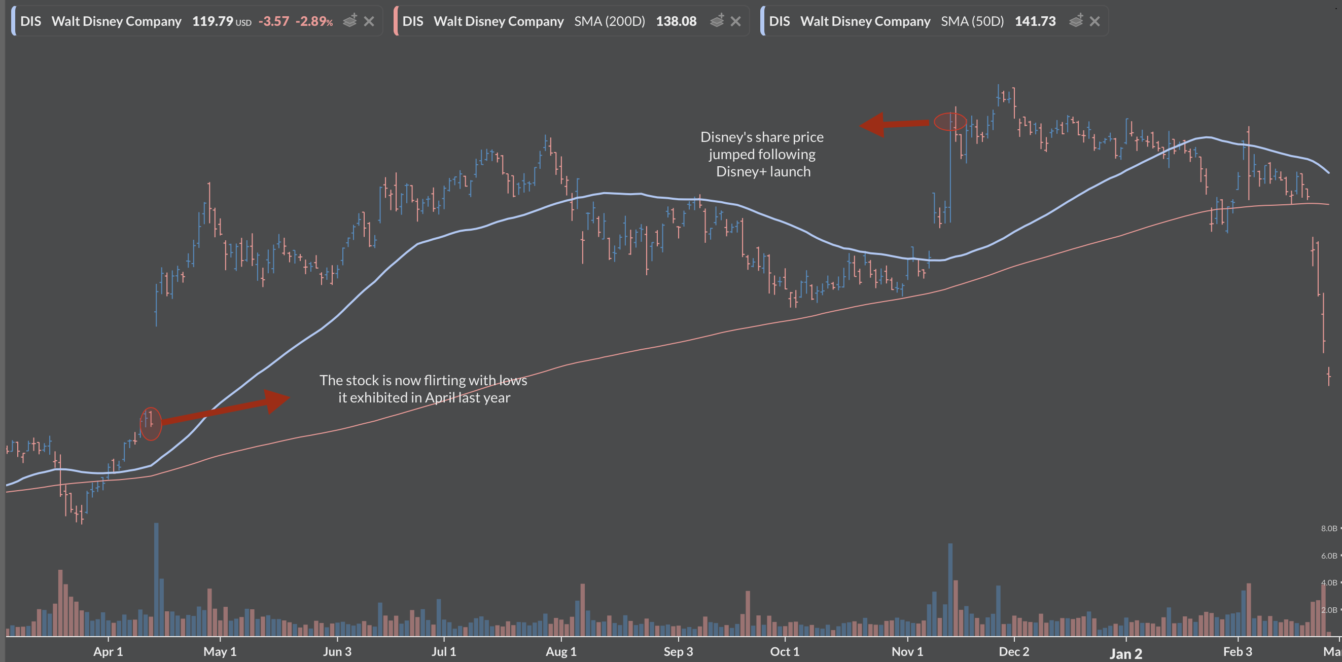随着迪士尼连续六个交易日股价下跌,很明显,过去20天的下跌幅度大于收益。迪士尼公司在最近一财季实现了20亿美元的净利润,同比下降23%,不过同期收入增长了36%,达到210亿美元。