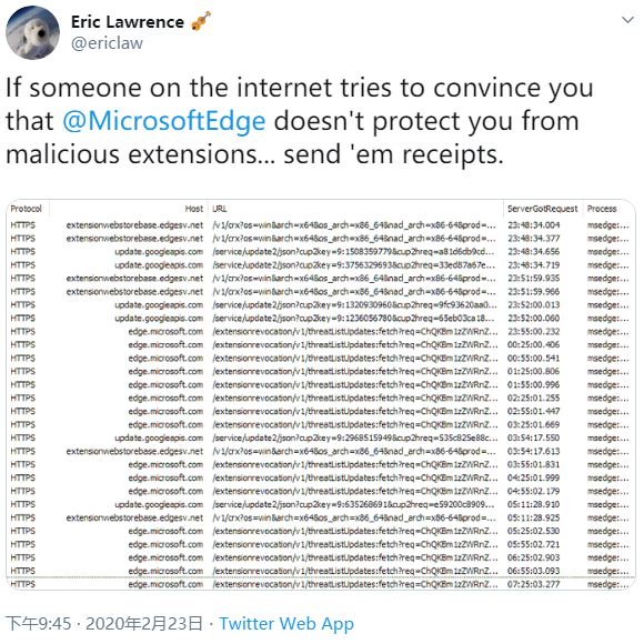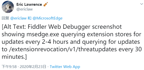 Eric Lawrence 在一条推文中证实:Microsoft Edge 浏览器会每隔 2~4 小时轮询检查一次扩展程序、同时每隔 30 分钟查询威胁更新。