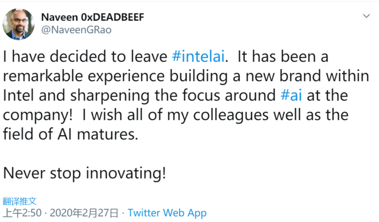 英特尔公司副总裁兼人工智能产品事业部总经理Naveen Rao本周四在Twitter表示已经决定离开Intel AI。他说:“在英特尔内部建立新品牌并增加公司对AI的关注是一个非常了不起的体验!希望所有同事都能够随着AI的成熟而变得更好。 永不停止地创新!”