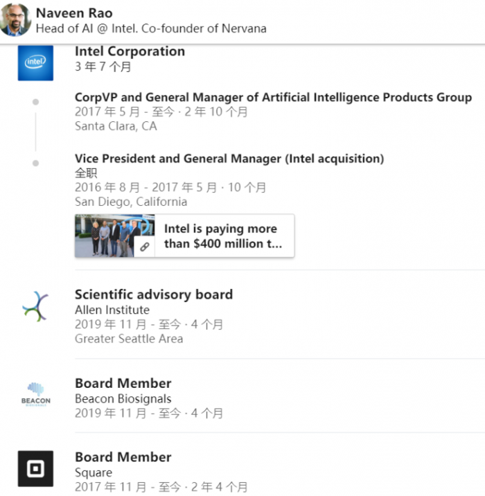 Naveen Rao也入职英特尔担任副总裁兼总经理,2017年5月开始担任英特尔公司副总裁兼人工智能产品事业部总经理。