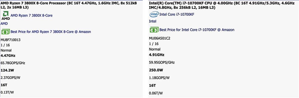 性能方面就跟诡异了,与同是8核16线程的锐龙7 3800X对比,后者频率3.9GHz/4.5GHz,125W下输出65.78GOPs/GHz的性能,10700KF在250W下是59.95GOPs/GHz。总成绩前者294.33GOPS,锐龙是308.90GOPS。