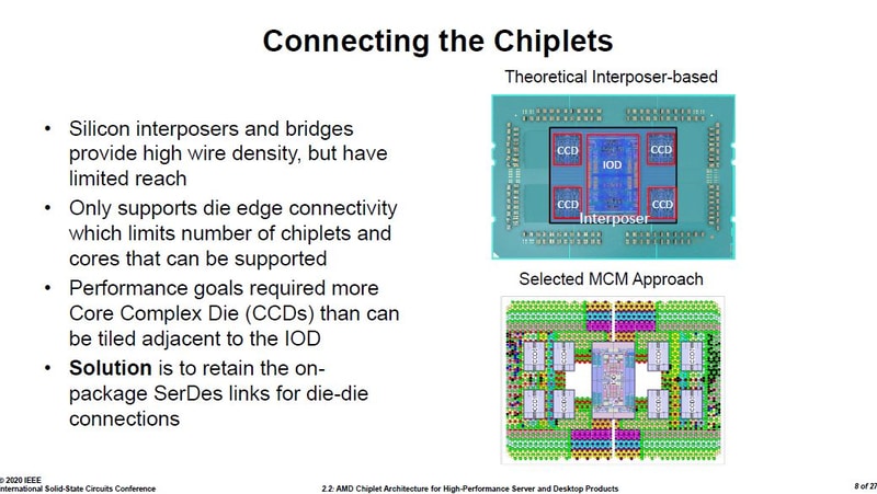 AMD随后具体介绍了他们采用的MCM封装方案的一些细节,包括芯片间互联的电路布局和基底针脚电路布局。