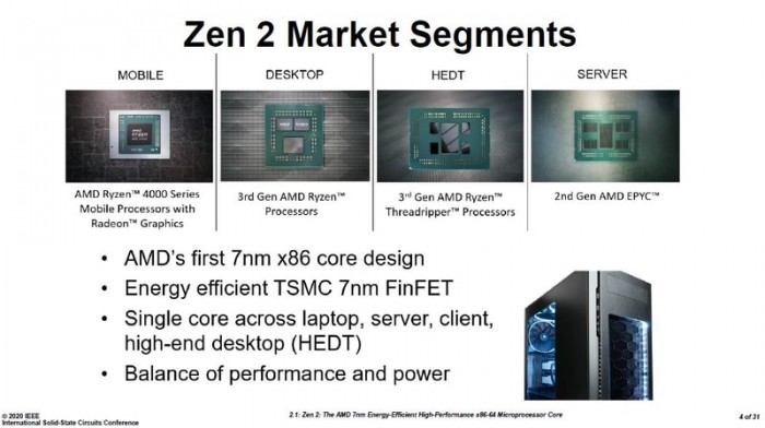 首先是Zen 2架构的特点,它是一个能完整覆盖当前市场的架构,上至服务器下至移动端,它都可以胜任,一个核心架构横跨几乎所有的平台。