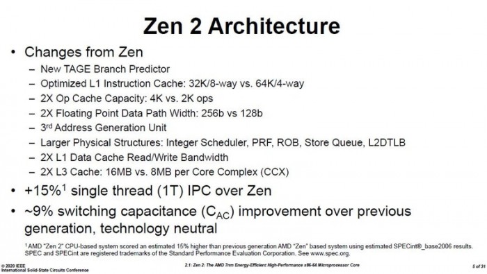 Zen 2架构相对于Zen架构有较大的改动,包括使用了全新的“TAGE”分支预测器,优化过的L1指令缓存,两倍的微指令缓存,两倍的浮点单元数据宽度,第三代AGU,加大的各种调度器、指令存储队列,两倍的L1数据缓存读写带宽,单个CCX拥有两倍的L3缓存。以上这个改动促成了Zen 2相对于Zen有超过15%的IPC提升。