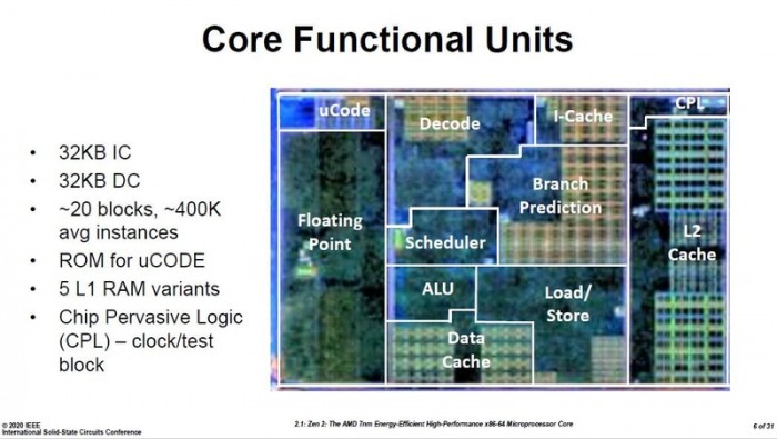 下面是Zen 2单个内核的显微照片,AMD标注了不同的功能分区。