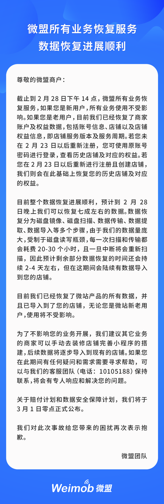 微盟表示,预计到2月28日晚上可以恢复七成左右的数据。