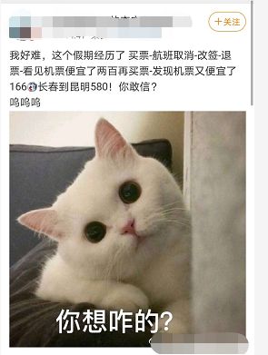 这段时间,一位网友在微博上分享了自己买票的经历,感叹机票接连降价,“这个假期经历了买票-航班取消-改签-退票-看见机票便宜了两百再买票-结果机票又便宜了两百,长春到昆明的机票只要580元,你敢信?”