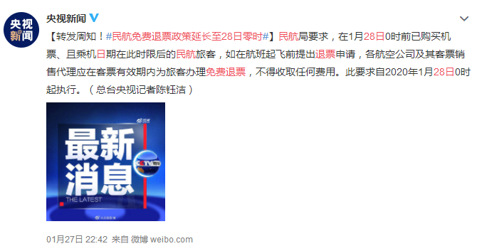为防止疫情蔓延,民航局做出要求,自2020年1月24日0时起,此前已购买民航机票的旅客自愿退票的,各航空公司及其客票销售代理机构应免费办理退票,不得收取任何费用,后又延长至1月28日零时。
