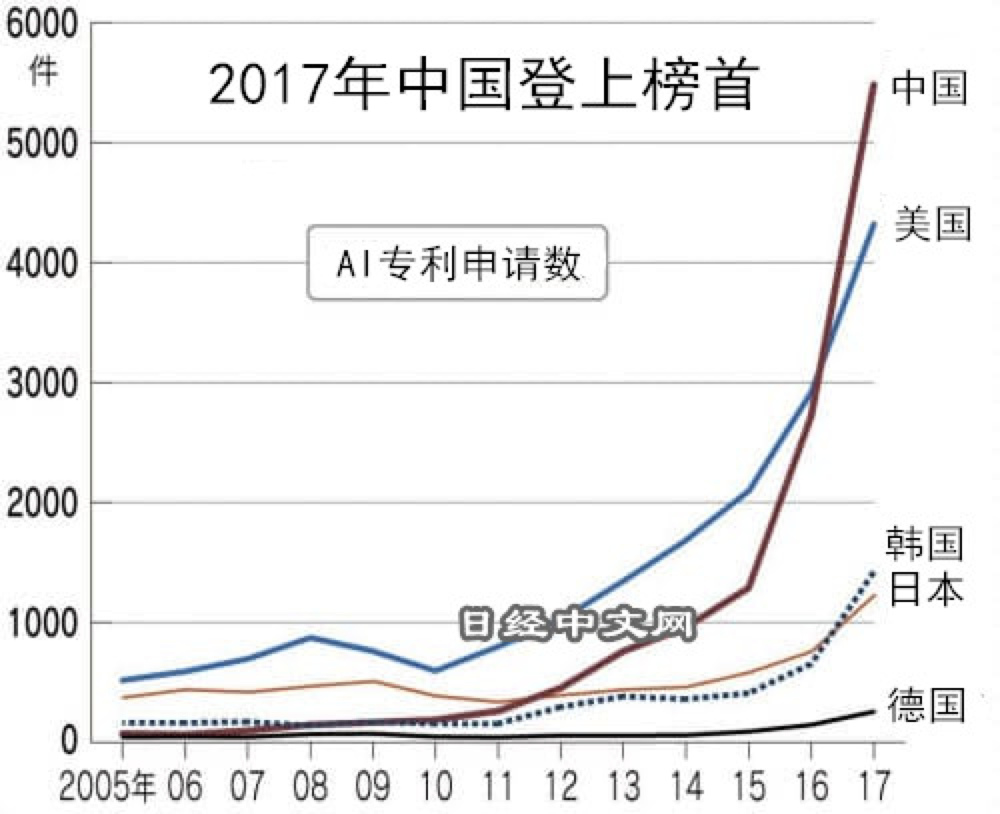 从各年度的全年数据来看,2017年以前一直由美国领跑,中国于2017年AI专利为5500件,首次超过了美国的4300件。据悉,申请数量的提升益于被称为“BAT(即百度、阿里巴巴、腾讯控股)”的IT大企业,在2015年以后的申请数量方面,百度仅次于IBM排名第2,阿里巴巴集团和腾讯控股也进入前10。