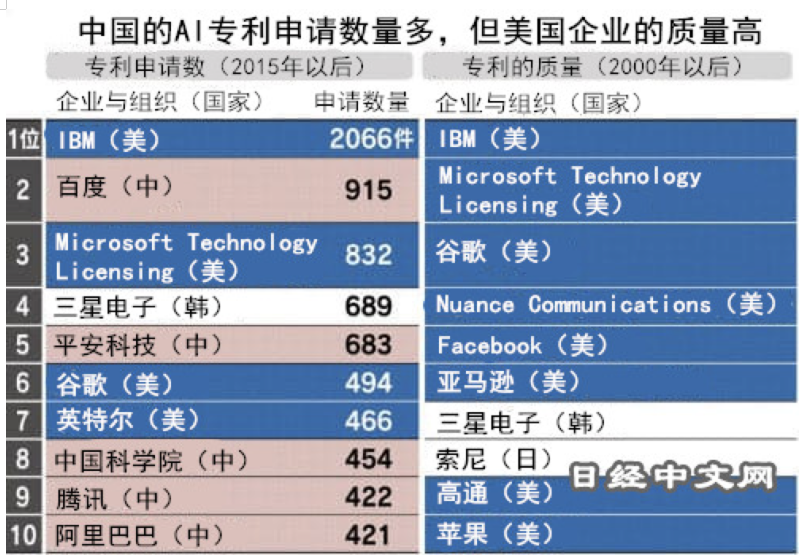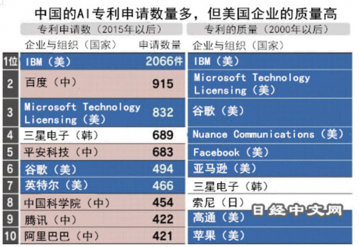 然而数量只是衡量AI能力的标准之一,更重要的则是专利的质量。分析数据的排行榜上,美国企业在前10中占有8席。IBM位居榜首,微软紧随其后,接着是GAFA(即谷歌、苹果、Facebook、亚马逊)。美国以外的企业只有2家,分别是第7位的韩国三星电子和第8位的日本索尼,中国企业没能进入前10。