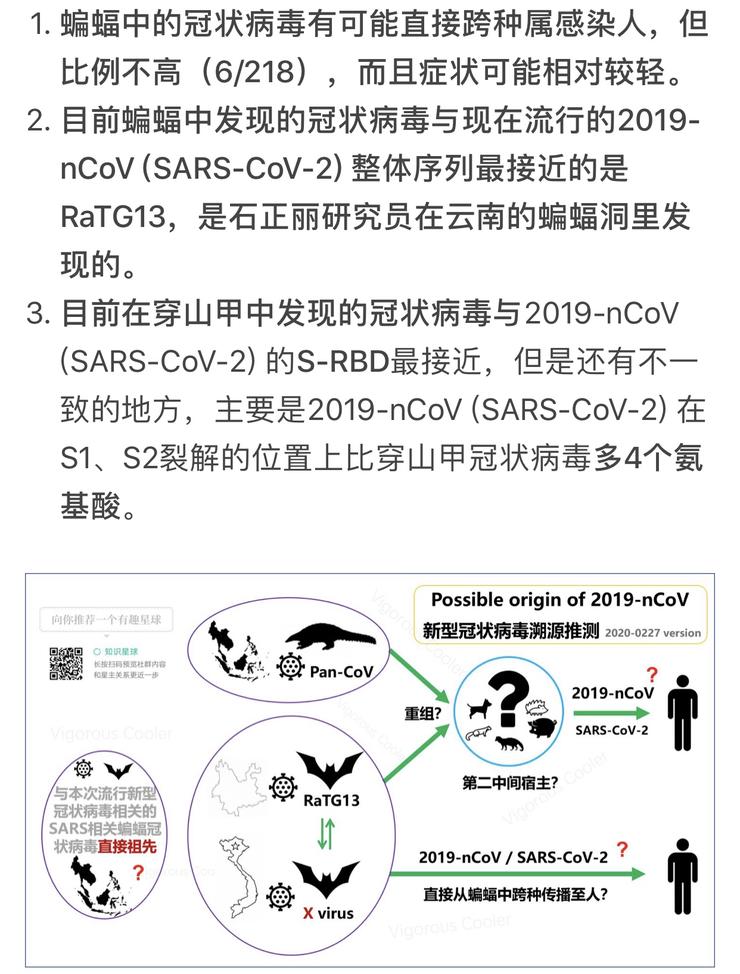 基于此,当前还存在一种“病毒重组”的说法——主要包括两个推论,一是中间宿主中发生了蝙蝠携带的冠状病毒和马来亚穿山甲携带的冠状病毒的重组,二是蝙蝠冠状病毒直接感染人。
