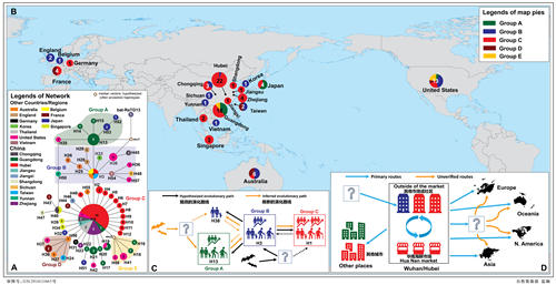 为细分来源,研究人员将 58 种单倍型(若干个决定同一性状的紧密连锁的基因构成的基因型)分成五组,采用标准是 3 个中心(古老超级传播者)单倍型(H1,H3 和 H13)和 2 个新的超级传播者单倍型(H56 和 mv2)。H56 同时是澳大利亚、法国和美国,以及我国台湾患者的传染源。其他国家患者因为样品比较少,大多数的来源比较单一,他们除了是武汉旅游输入或在武汉感染外,有一些人可能是在广东、新加坡等地被感染。