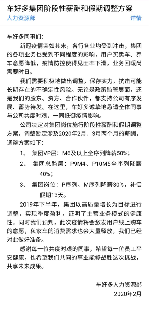 2月28日晚间消息,车好多集团宣布对集团岗位施行阶段性薪酬和假期调整方案,调整暂定涉及2020年2月、3月两个月的薪酬,其中集团P序列、M序列降薪30%,补偿假期13天,集团总监层降薪40%,集团VP层降薪50%。