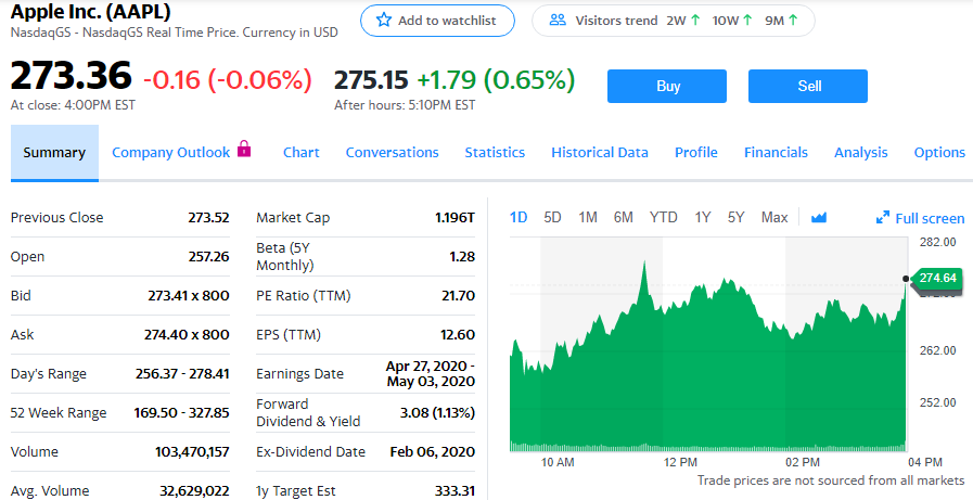 星期五苹果股价跌幅一度高达6.3%,但随后开始收窄。截至收盘,苹果股价下跌0.16美元,跌幅为0.06%,报收于273.36美元,盘后交易中,苹果股价一度上涨2.6美元。苹果早盘大幅下跌的原因,可能与新冠肺炎疫情传播导致的市场恐慌情绪有关。疫情对苹果产生不利影响,这并不是个秘密。位于中国的供应链厂商都延长了春节假期,工厂复工缓慢。苹果2月17日表示,iPhone供应商恢复正常生产时间晚于预期,意味着iPhone供应短期出现紧张局面,公司预计第二财季营收将低于预期。之后,苹果股价累计下跌17%。部分投资者可能认为苹果股价下跌幅度太大了,值得入手,这可能是今天苹果股价跌幅收窄的一个原因。虽然苹果称第二季度营收将低于预期,但CEO蒂姆·库克(Tim Cook)仍然对公司长期前景充满信心。他在本周接受媒体采访时说,“总的来说,我认为这只是暂时而非长期的,从基本面来看,苹果仍然相当强大,这是我对公司的看法。”